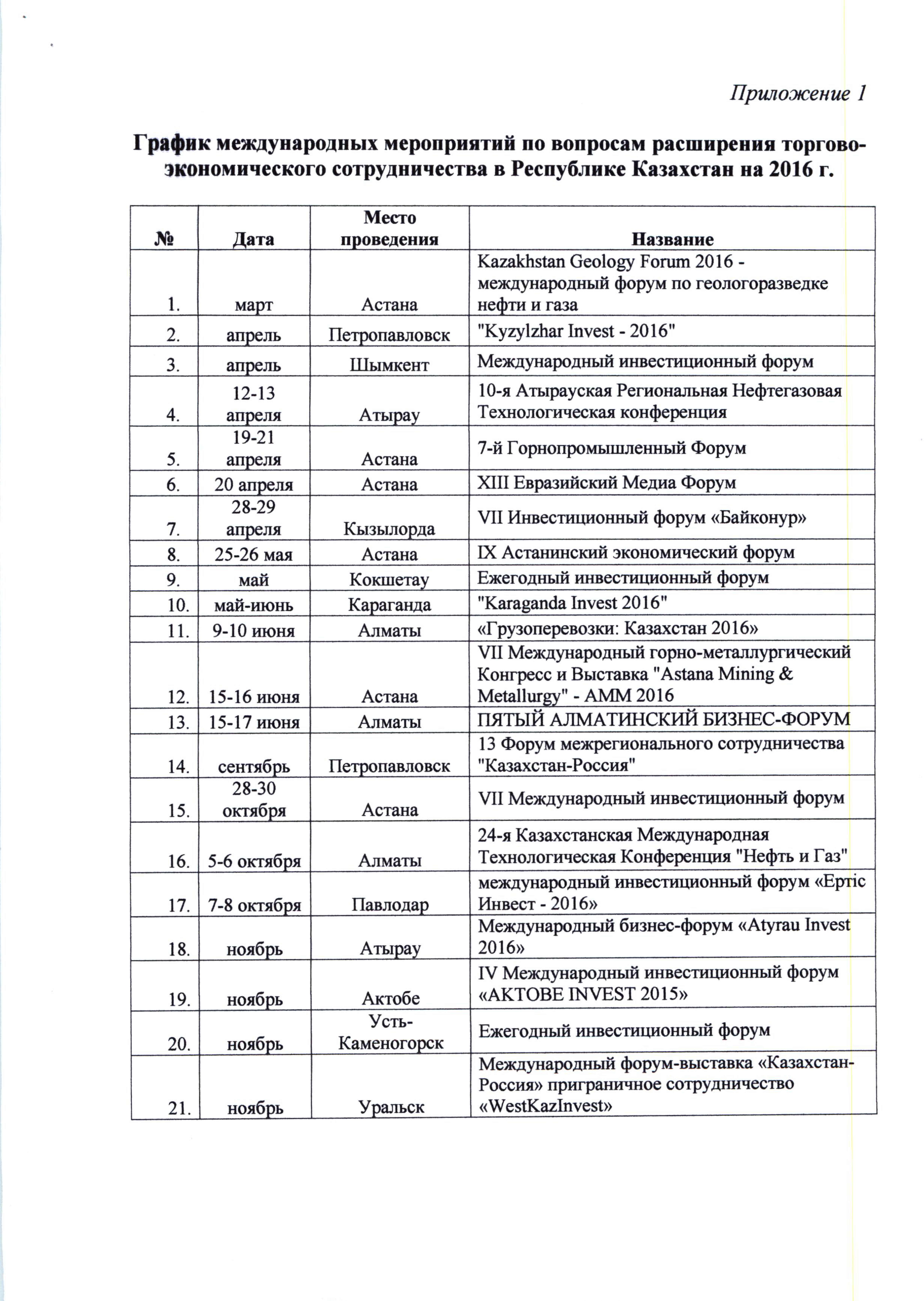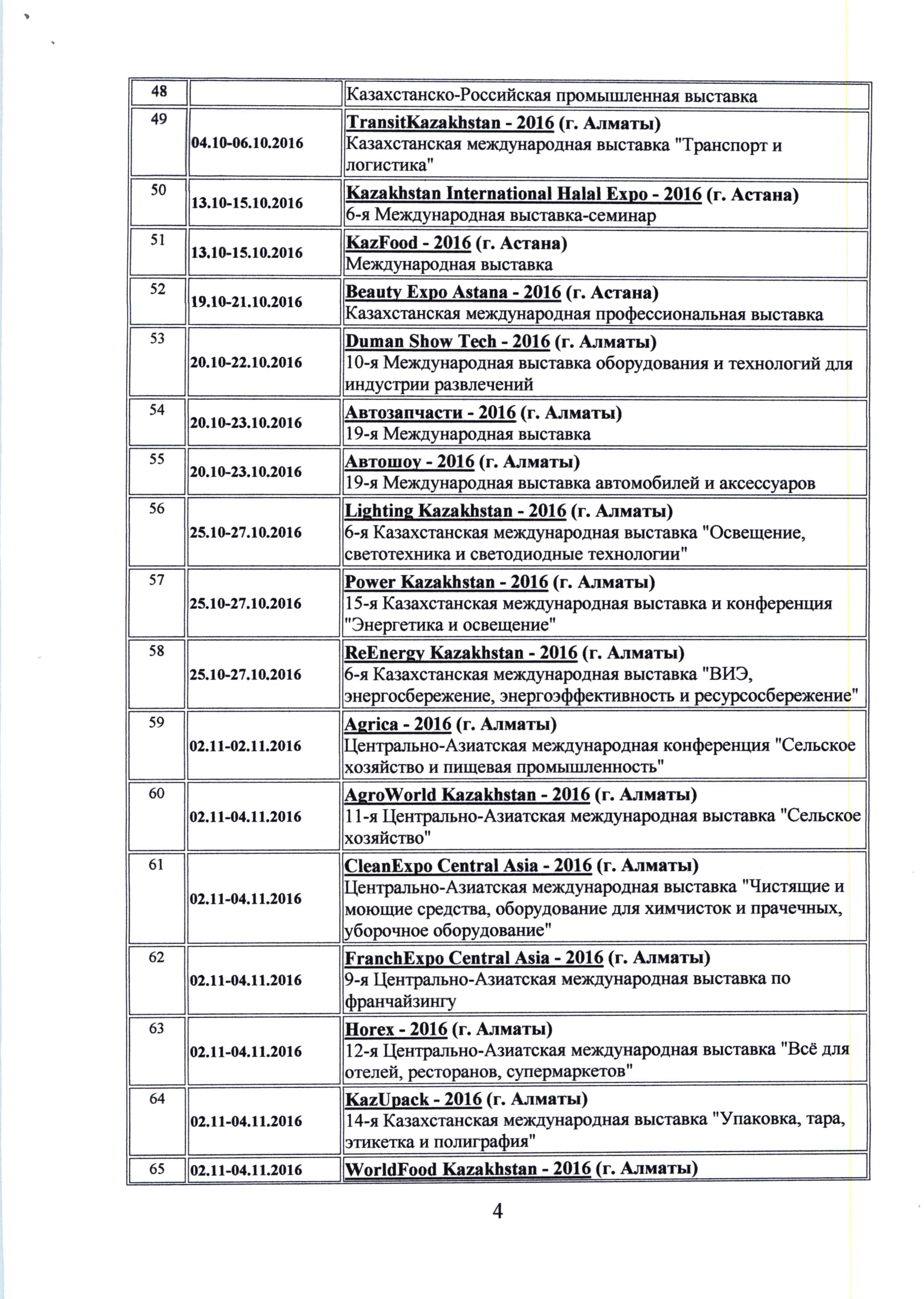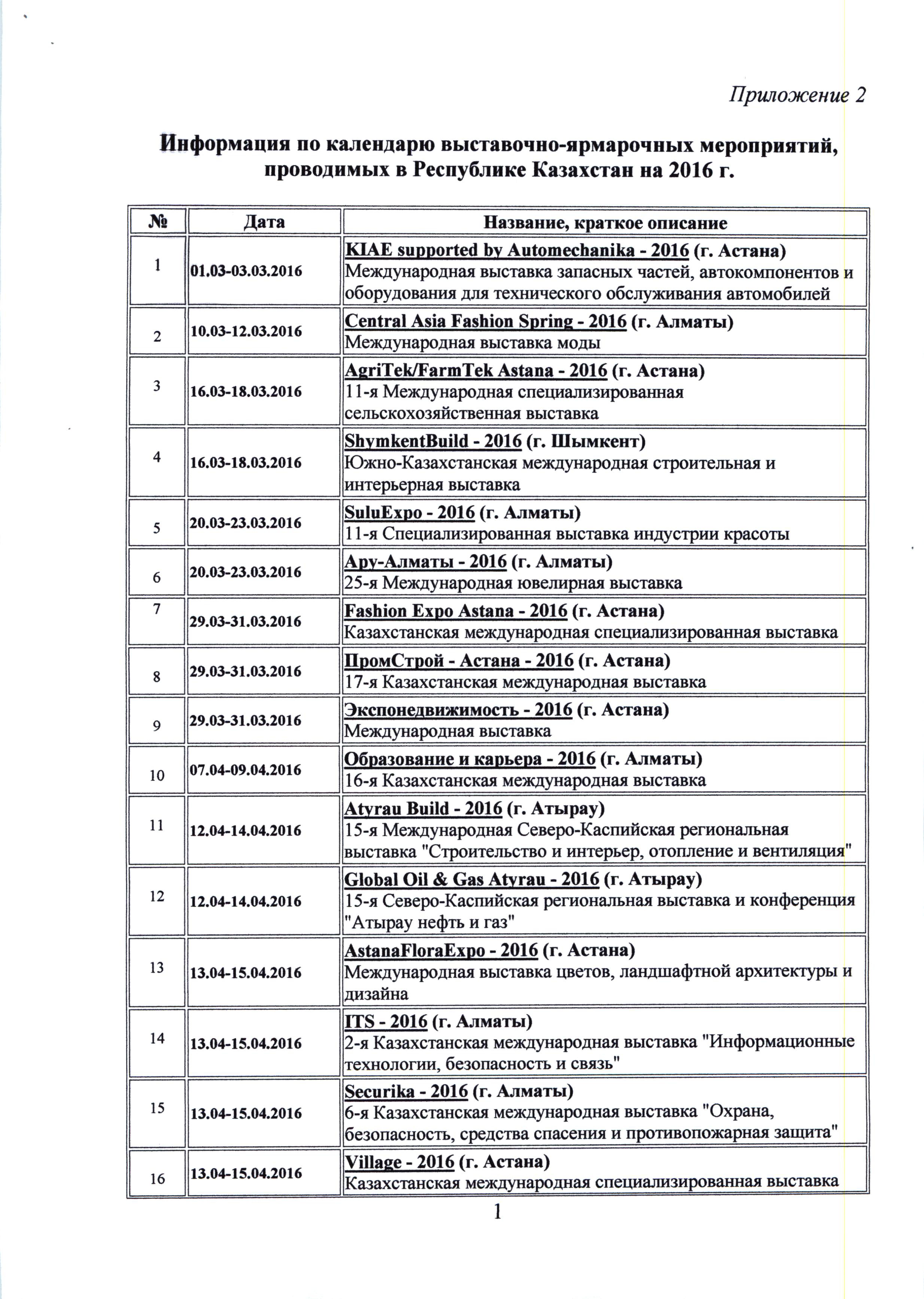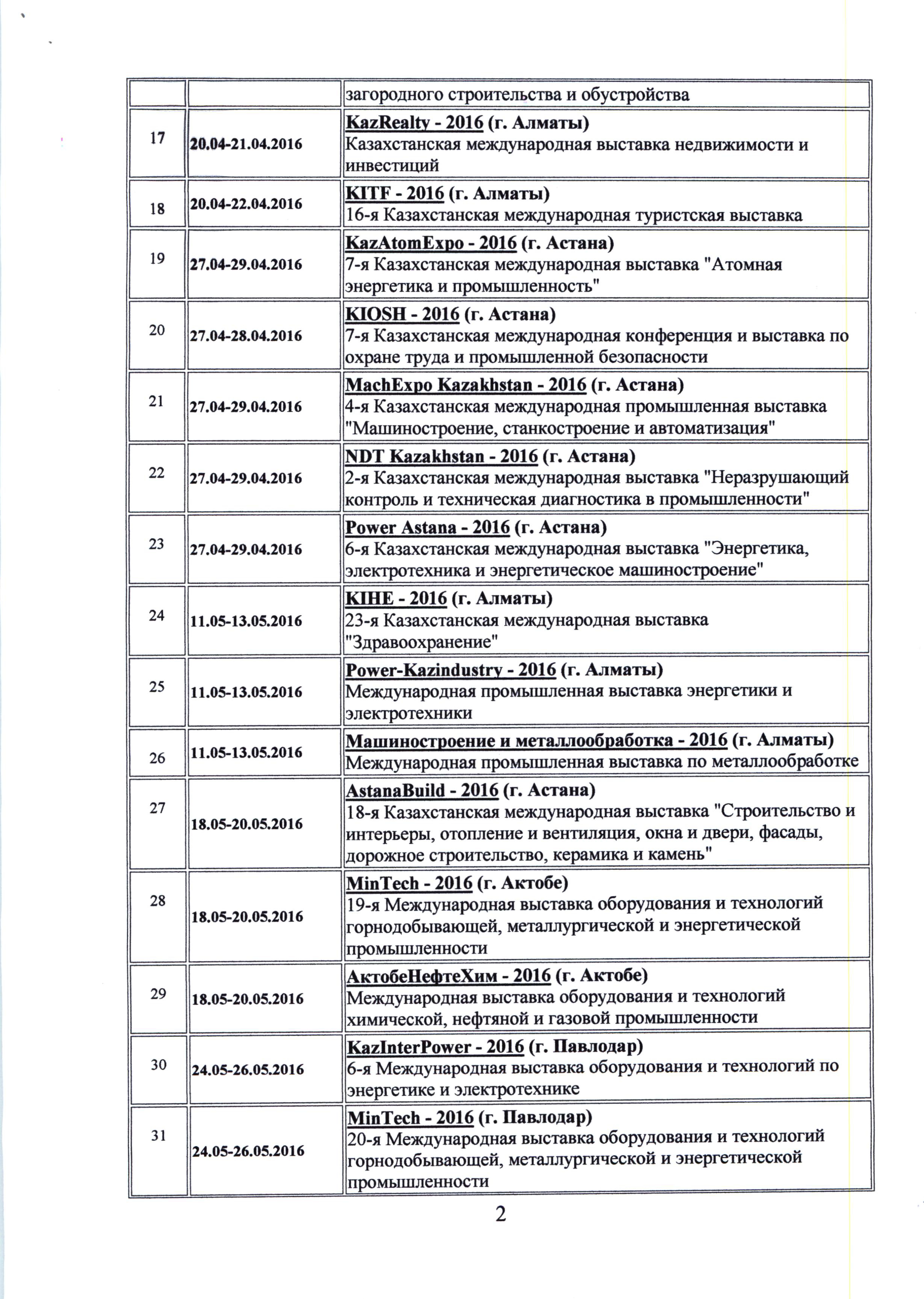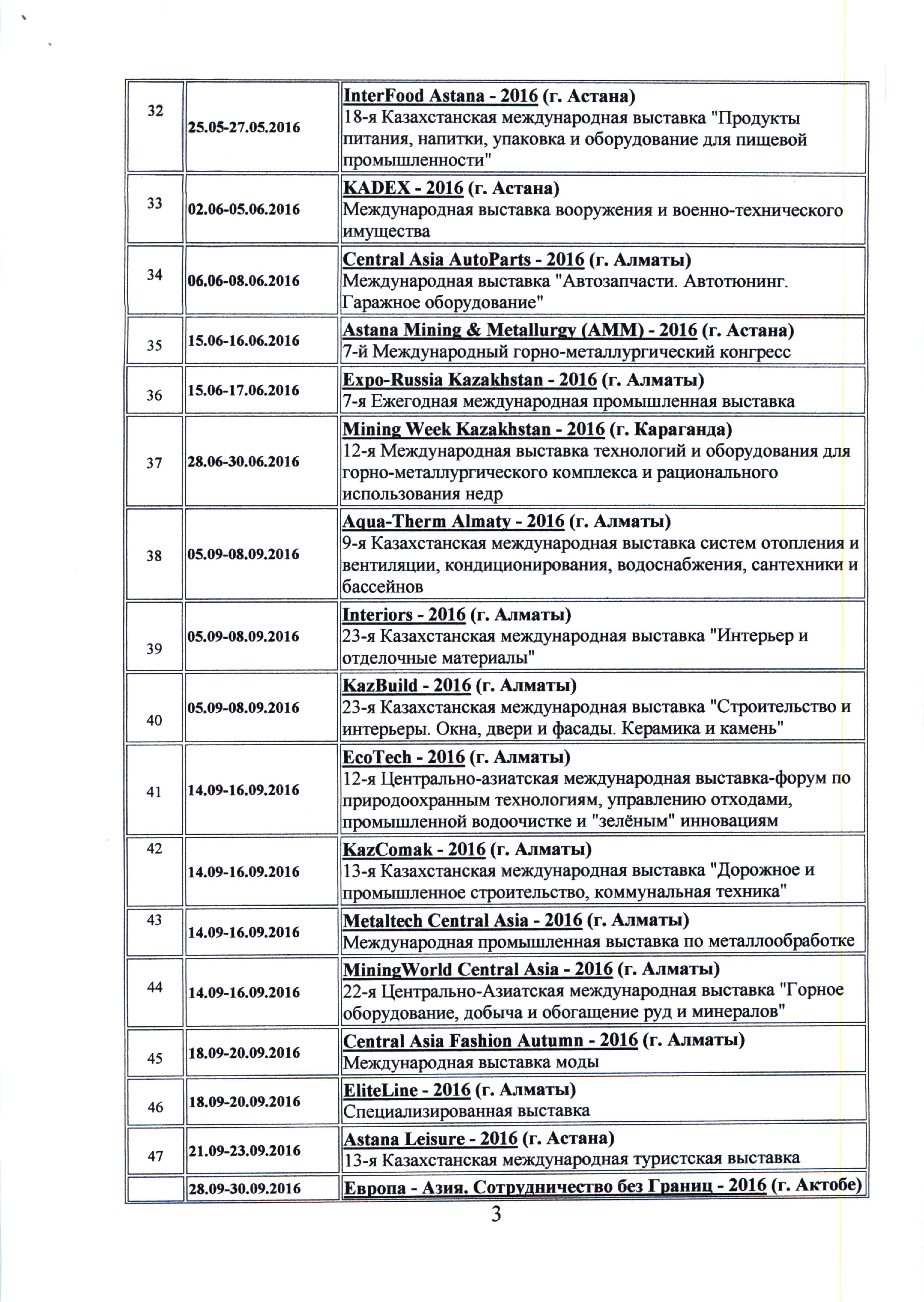 Вниманию заинтересованных компаний и предприятий публикуем представленный Торговым представительством Республики Казахстан в Российской Федерации график международных выставочно-ярмарочных мероприятий, форумов и конференций в 2016 году, планируемых к проведению в Республике Казахстан.